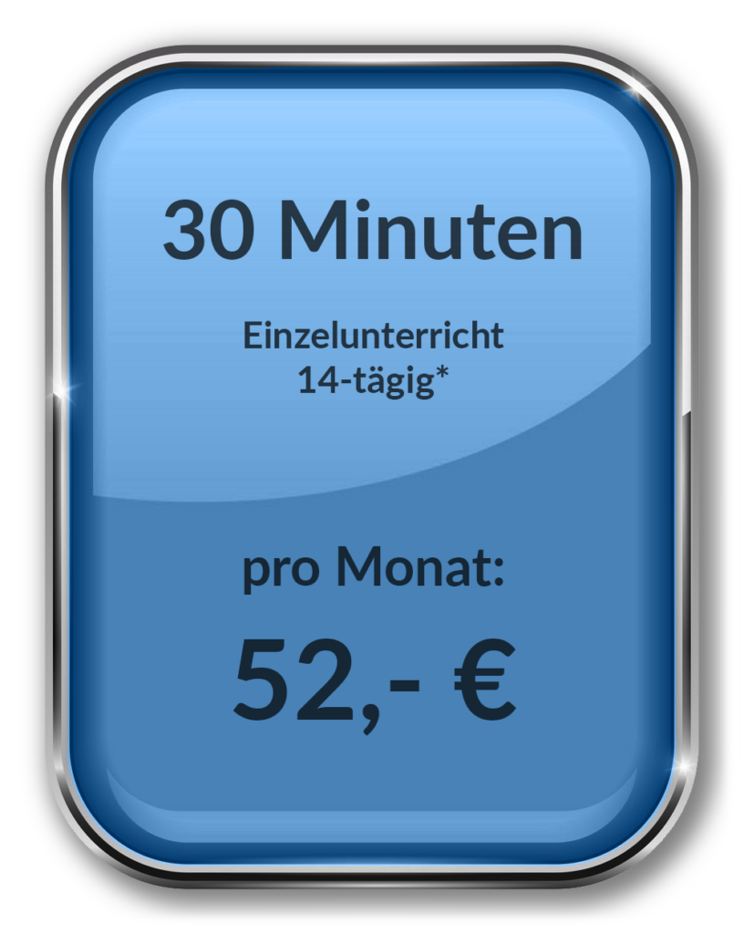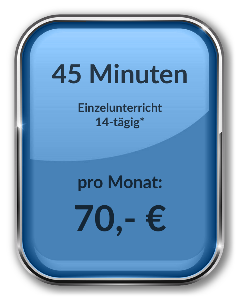 Bei mehreren angemeldeten Personen aus einer Familie gibt es 5% Rabatt pro Person. Bei allen Kursen gibt es keine Mindestvertragslaufzeit. Alle Preise für Einzel- und Gruppenunterricht gelten sowohl für Kinder, als auch für Erwachsene. Innerhalb eines Jahres findet nach Abzug der Ferien und Feiertage 36 mal Unterricht statt (bei einem 14-tägigen Kurs 18 mal). Während der Hamburger Schulferien, sowie an gesetzlichen Feiertagen findet kein Unterricht statt. Um niemanden auf Grund von Feiertagen, die ggf. häufig auf denselben Wochentag fallen, zu benachteiligen, gibt es auf das Jahr verteilt sog. „Ausgleichstage“, durch die gewährleistet ist, dass es an jedem Wochentag aufs Jahr gesehen genau 36 Unterrichtstage gibt. Diese Ausgleichstage, sowie die Ferien und Feiertage, sind im Menü unter dem Link Ausgleichstage einsehbar. Da die o.g. Preise auf ein ganzes Jahr kalkuliert sind, sind diese unabhängig von der Feriensituation monatlich zu zahlen. Ein Unterrichtsvertrag kann mit einer Frist von sechs Wochen zu den folgenden Kündigungsterminen gekündigt werden: 28.2., 31.5., 31.8., 30.11. Familien, die BuT-berechtigt sind, können eine staatliche Förderung in Höhe von 15,- € monatlich in Anspruch nehmen, sofern die Behörde den Antrag genehmigt.